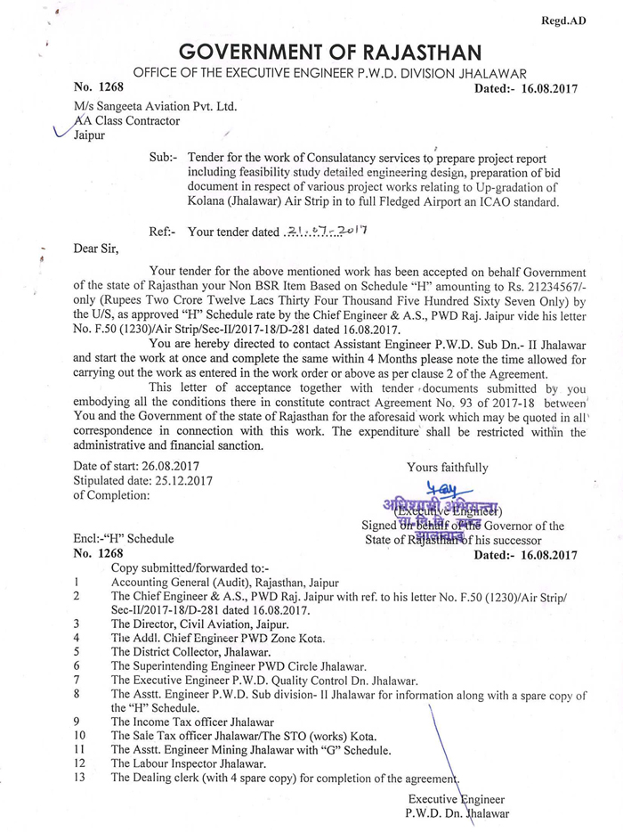 5 Airstrips, Govt of Rajasthan 2018 Rs. 39,98,00,000.18/-