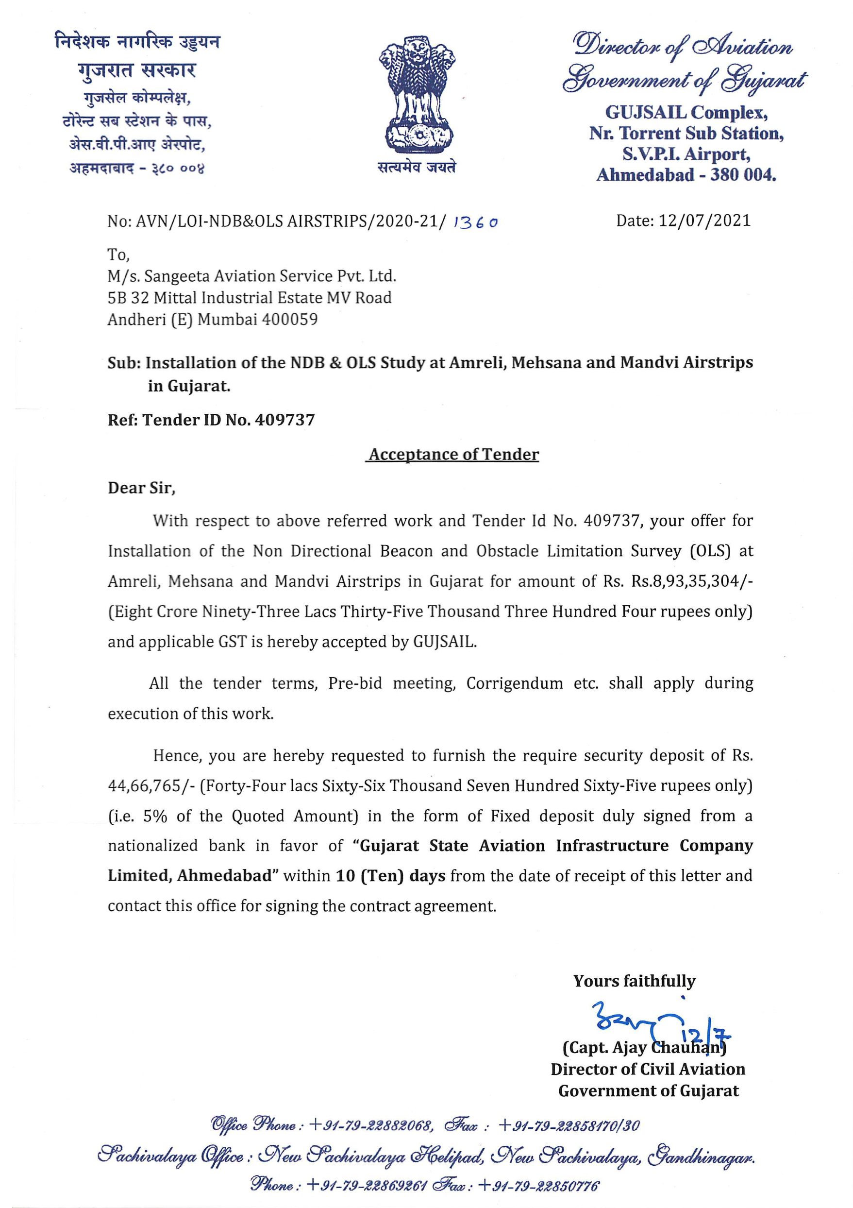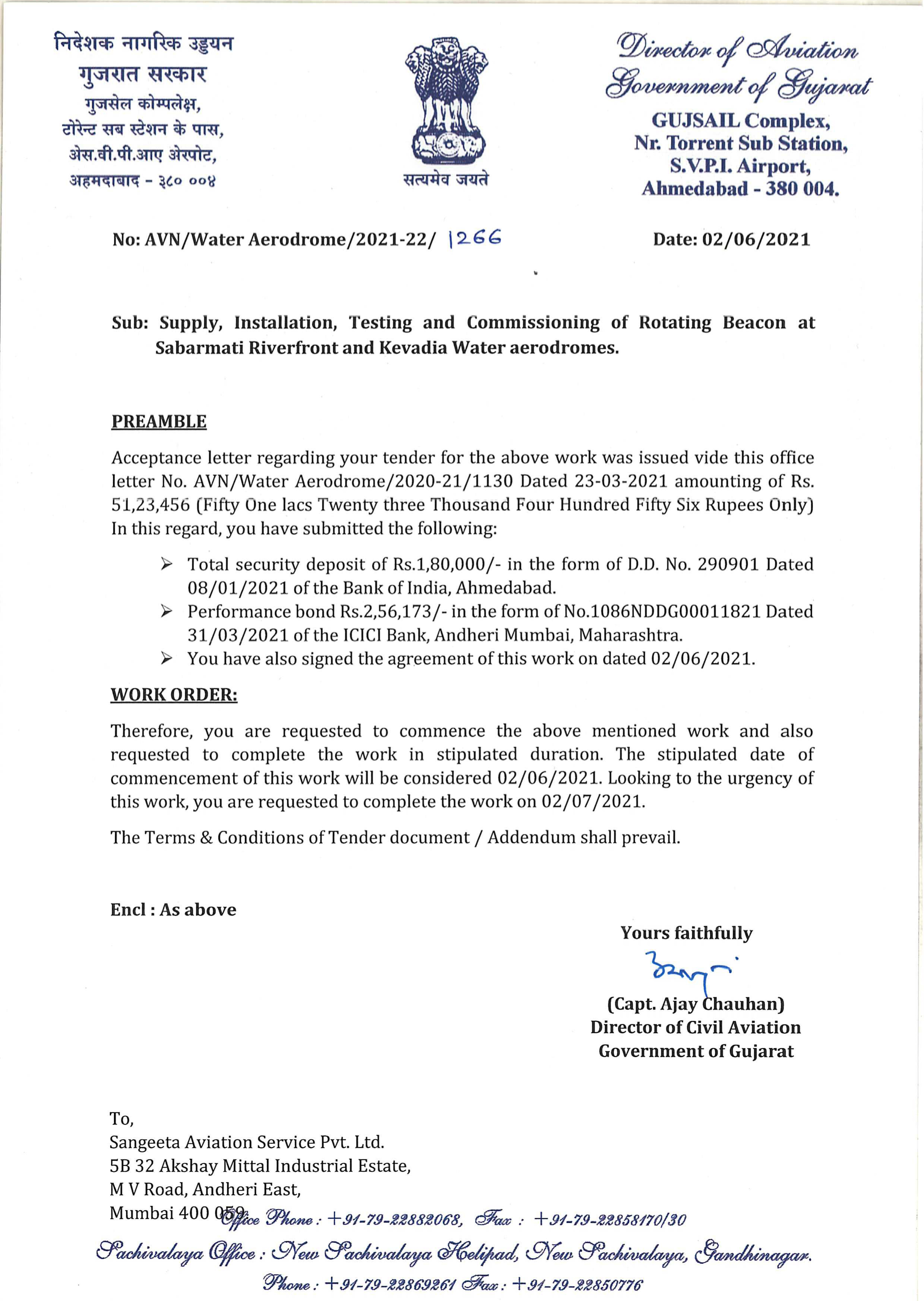 Kevadiya & Sabarmati Water Aerodromes, Govt of Gujarat 2021 Rs. 51,23,456.78/-